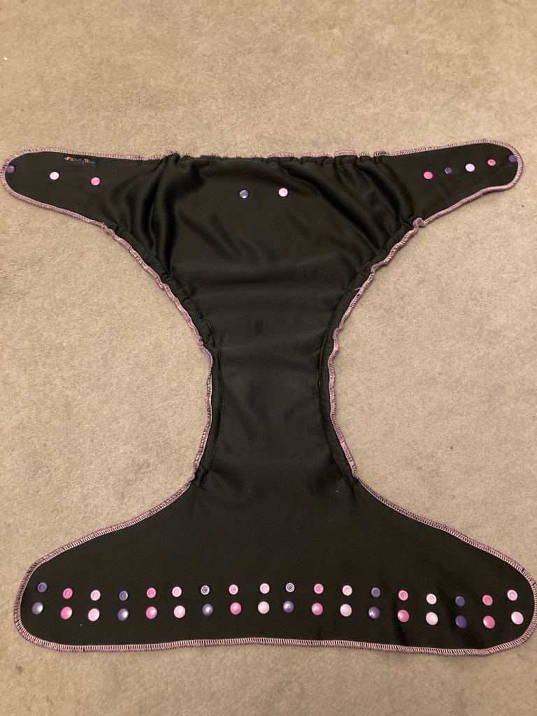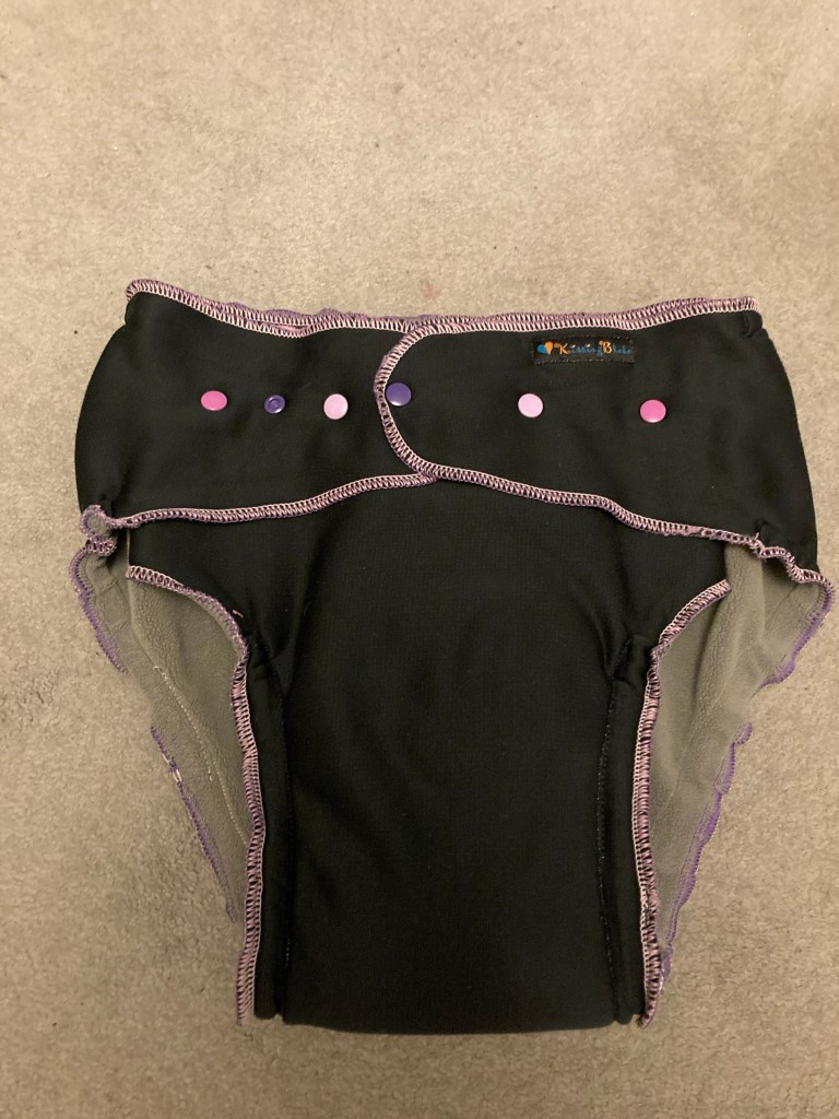 With cloth nappies in adult sizes still being something of a rarity, one way to find a product that suits your needs is to find individuals and companies that are branching out from baby/child nappies to adult sizes or are happy to make custom sizing that is larger. Kissing Blake (KB) is a store on Etsy that is run by the wonderful Leah. When I first contacted Leah to see what options there might be for an adult-sized product, she was very helpful and not long after had added an adult cloth nappy to the store in response to enquiries she had received from me and others. In terms of managing expectations, this is a small enterprise (based in the US) and you aren’t going to place your order today and have your customer-made nappy within 48 hours! Leah takes time to discuss and confirm the options, make the item and have it shipped (thousands of miles for me!) so this is not a quick fix. However, you will get a custom product to suit your needs and the quality is excellent. This is the only product of this kind on the market.