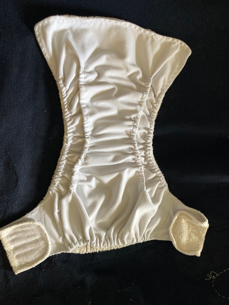 The cotton trifold inserts are folded in 3 (as the name suggests!) and placed inside the pocket of the nappy to provide extra absorbency. Apparently the pockets can accommodate up to 3 inserts, but I have only used a maximum of 2, as I find it becoming a bit too bulky and uncomfortable for me at this point. Absorbency wise these can hold about 2000ml depending on the inserts you use and I expect this could be increased if they were combined with inserts including Zorb fabric, although the only Zorb inserts I currently have are quite small.